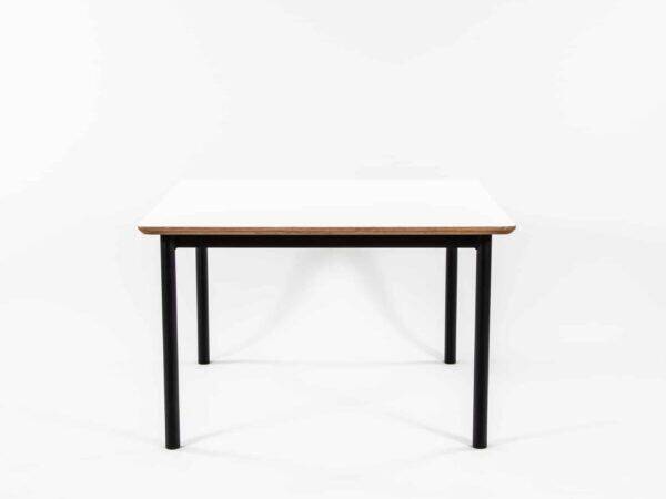 • Square Puffer Table with white table top, ply edge and textura black powder coated steel frame