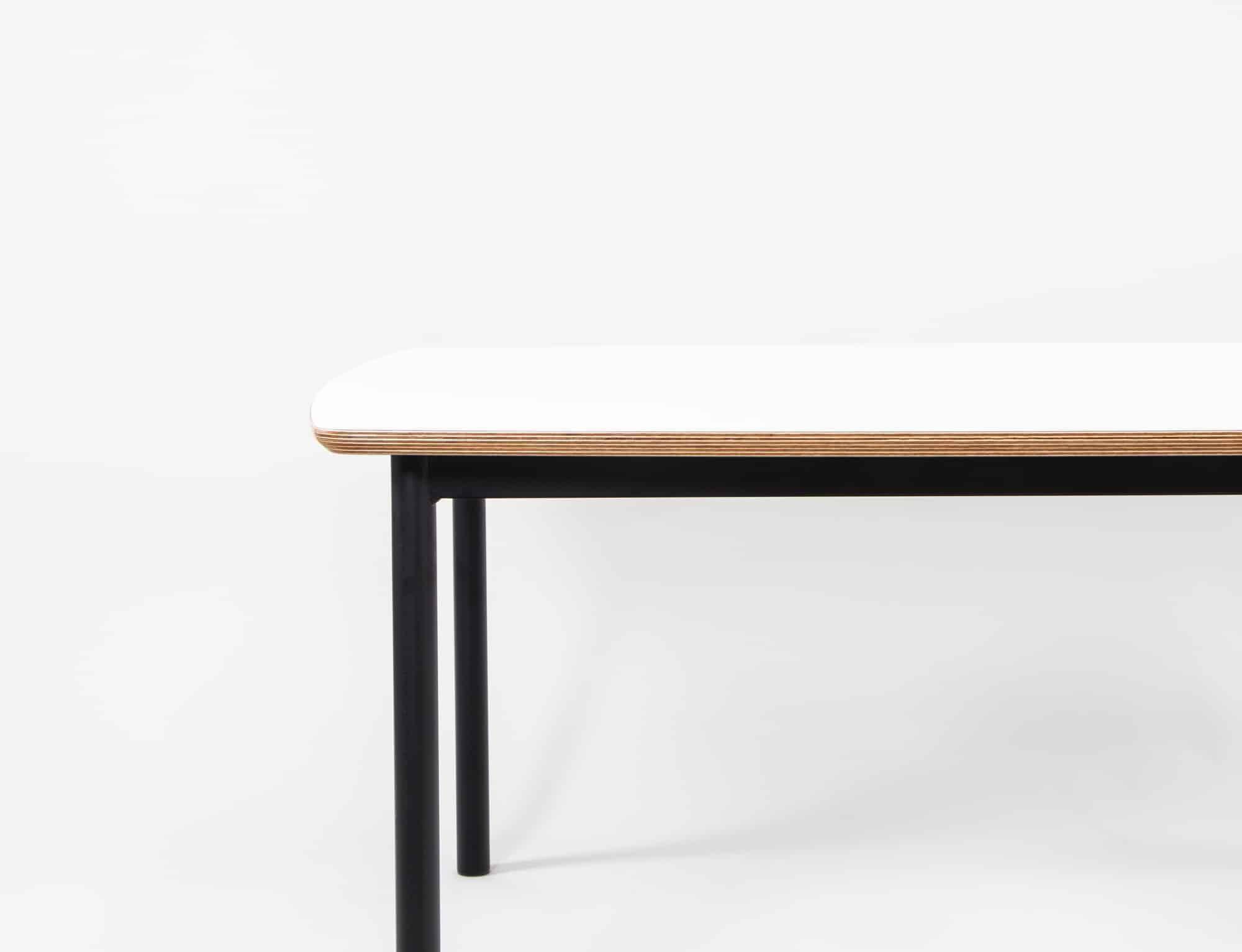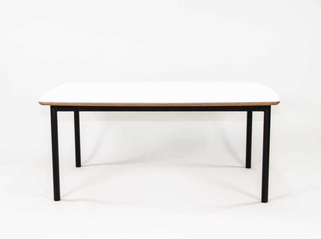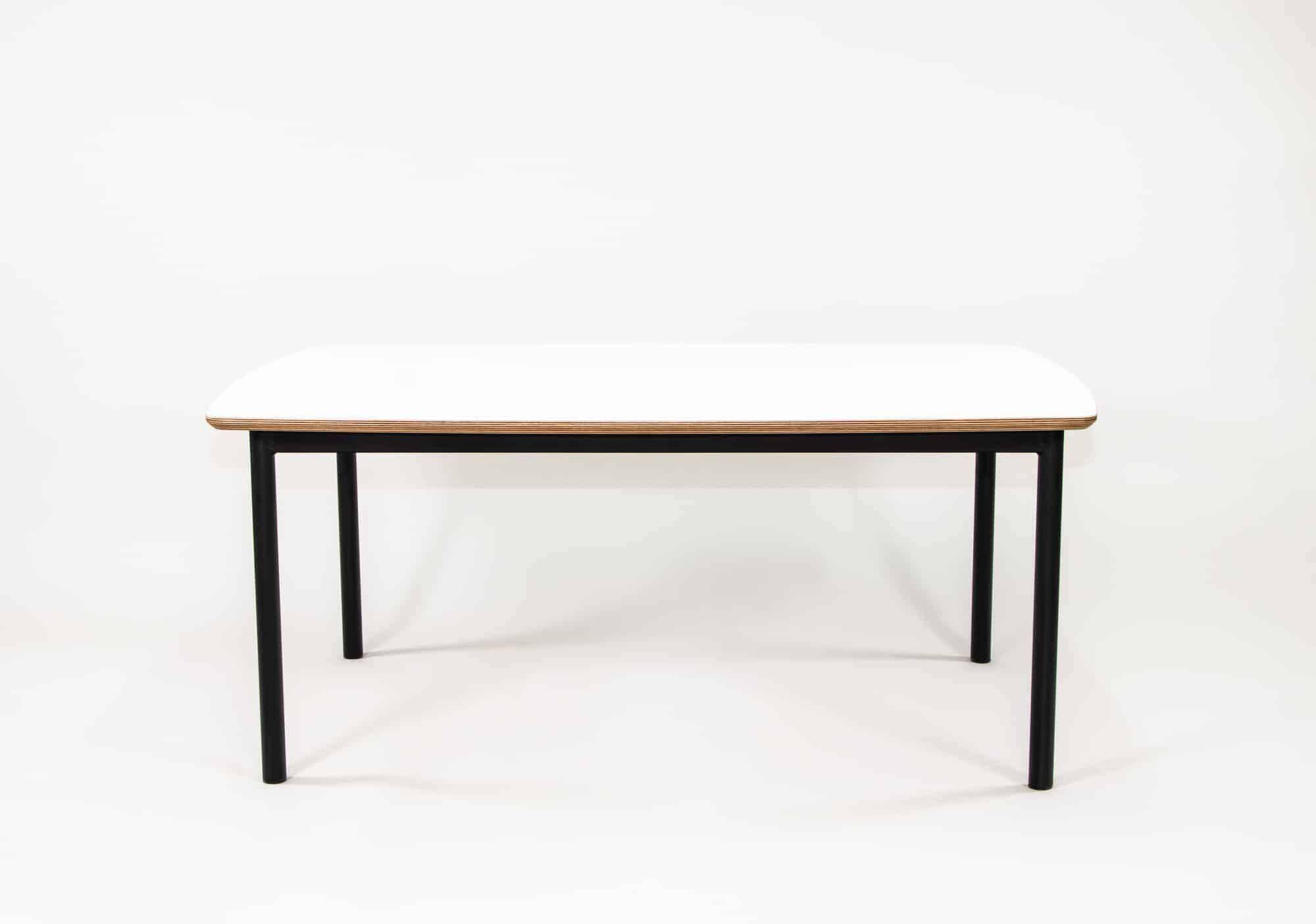 • Rectangle Puffer Table with white table top, ply edge and textura black powder coated steel frame