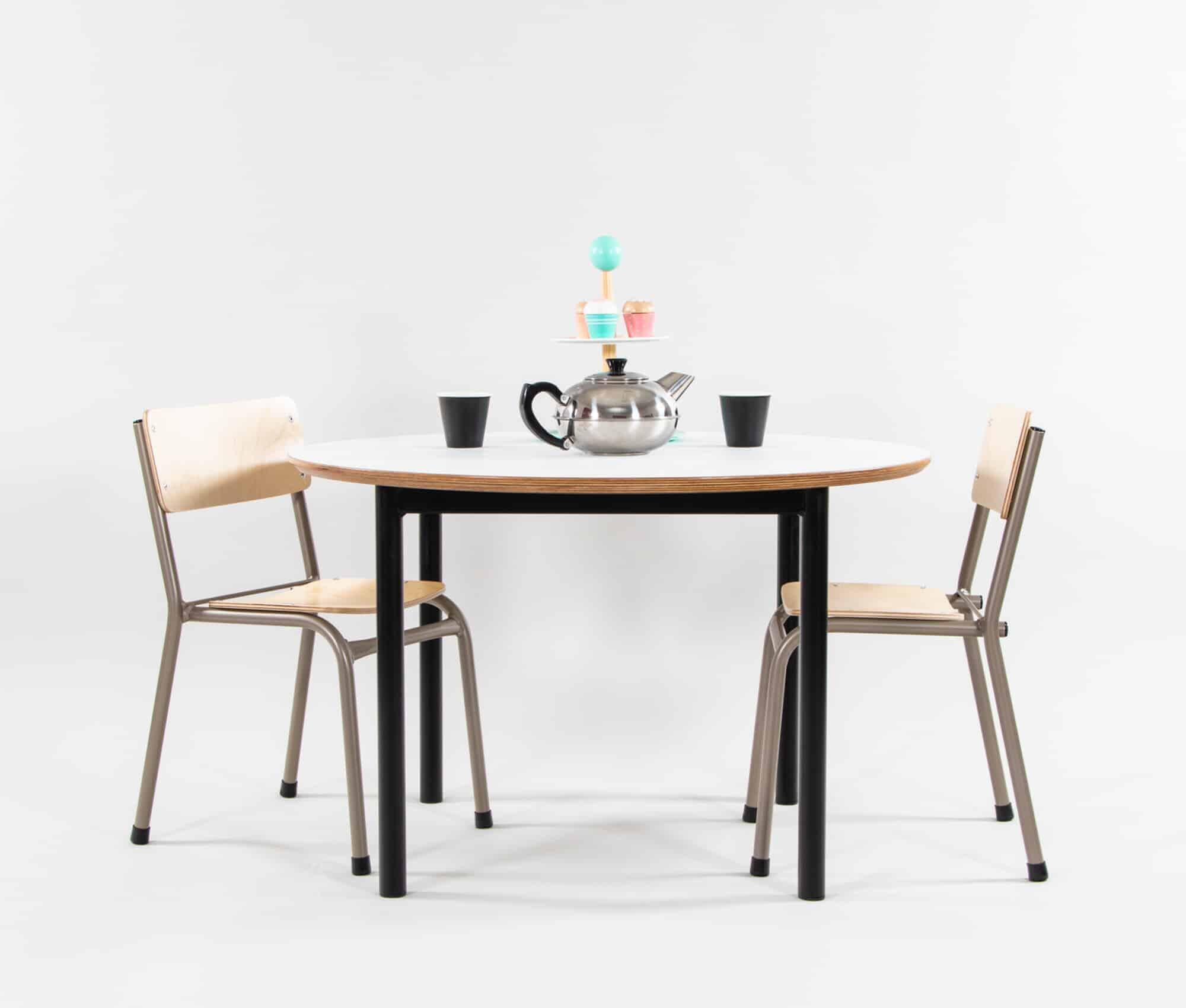 • Round Table with white table top, ply edge and textura black powder coated steel frame