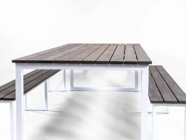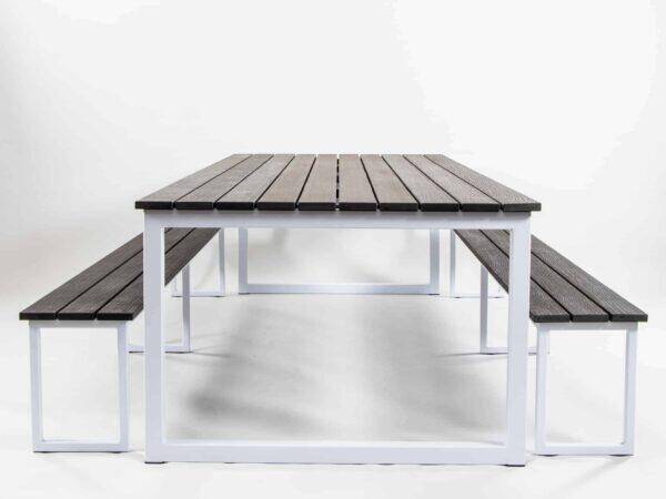 We manufacture these Benches using galvanized powder coated steel for the frame and Futurewood planks for the bench top. Futurewood is a branded plastic wood composite made from 100% recycled materials – No ongoing maintenance required.