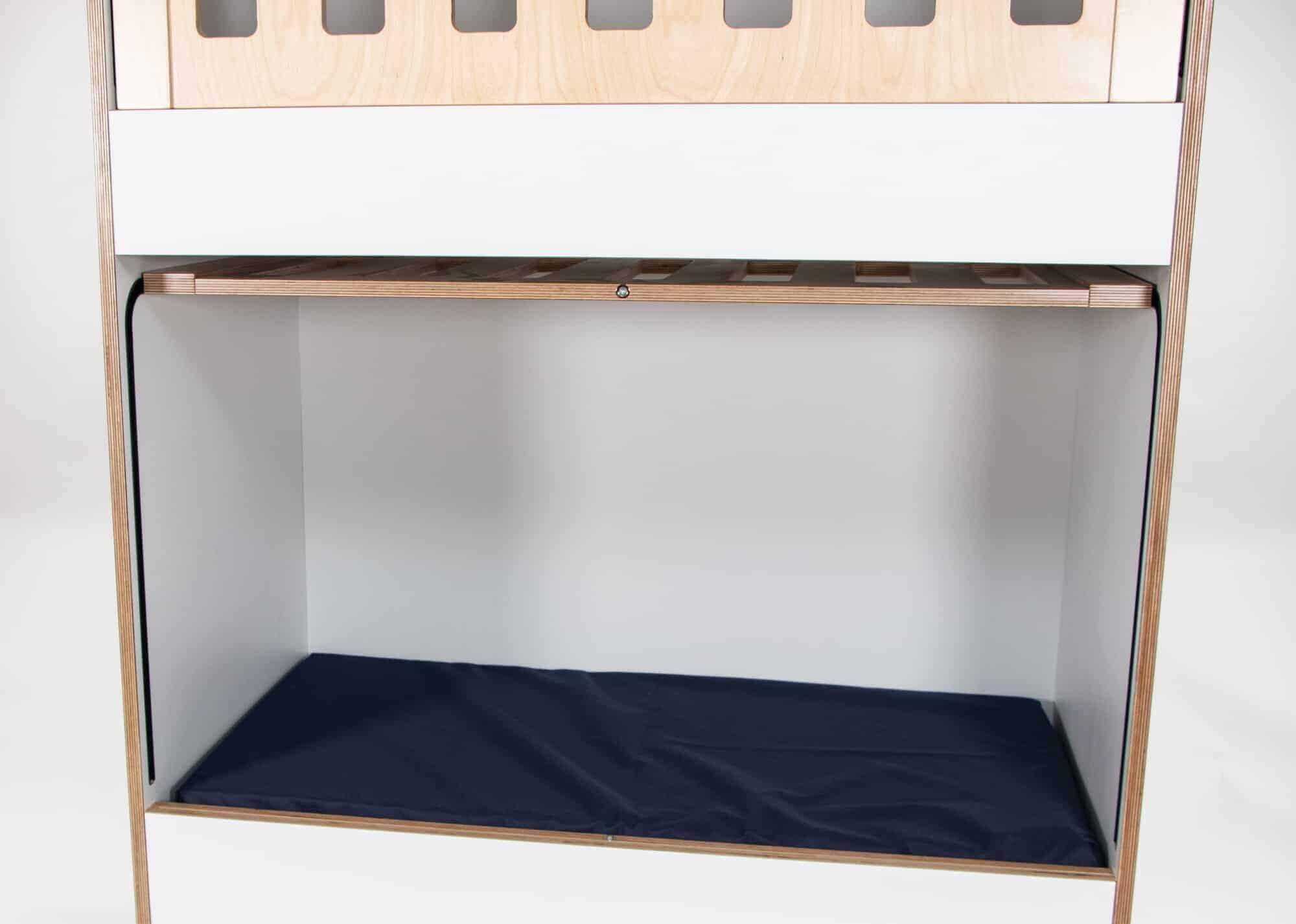 You can be assured of our high quality and workmanship, easy to use drop gate function, quality fittings and fixtures, easy to clean surfaces and beautifully finished European birch plywood with a premium hard wearing laminate surface. We manufacture all our cots with LOVE and nothing less. This Cot has a lower base on the bottom bunk, this will allow taller children to sit and stand safely when they wake up.