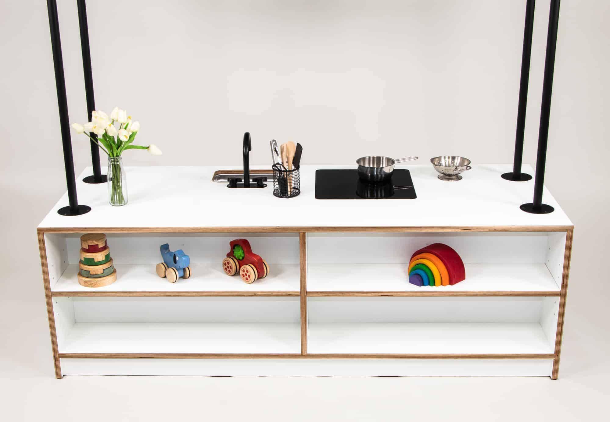 Our Family Play Storage, designed by us, incorporates all your family play needs (on one side) and open storage on the other.