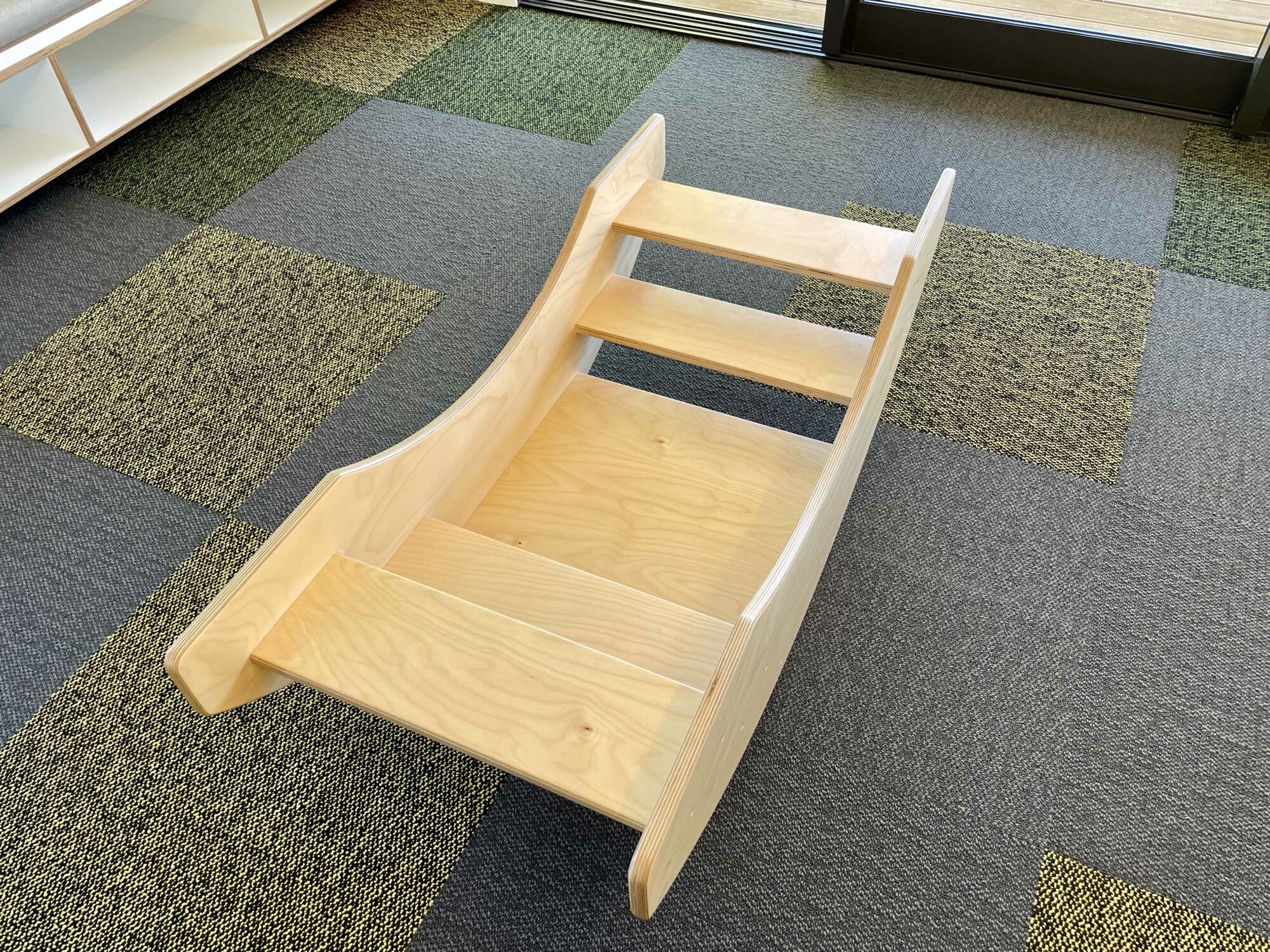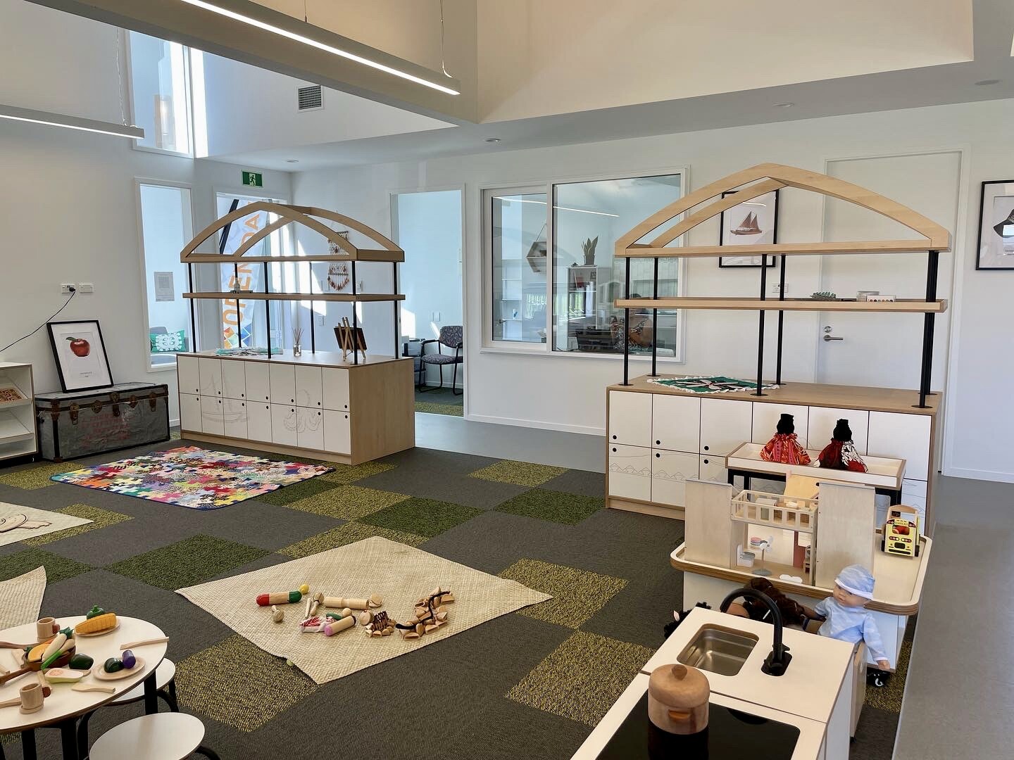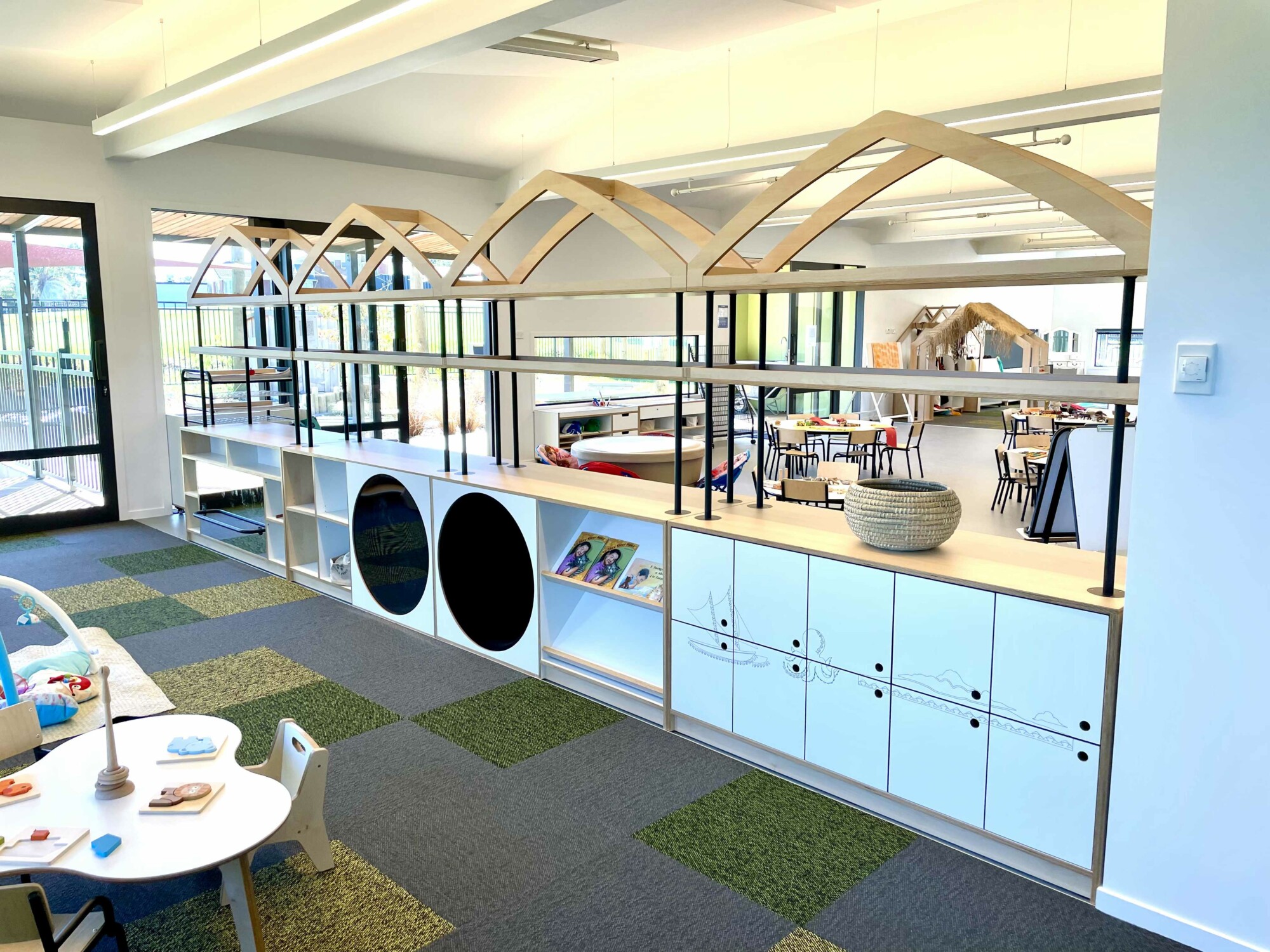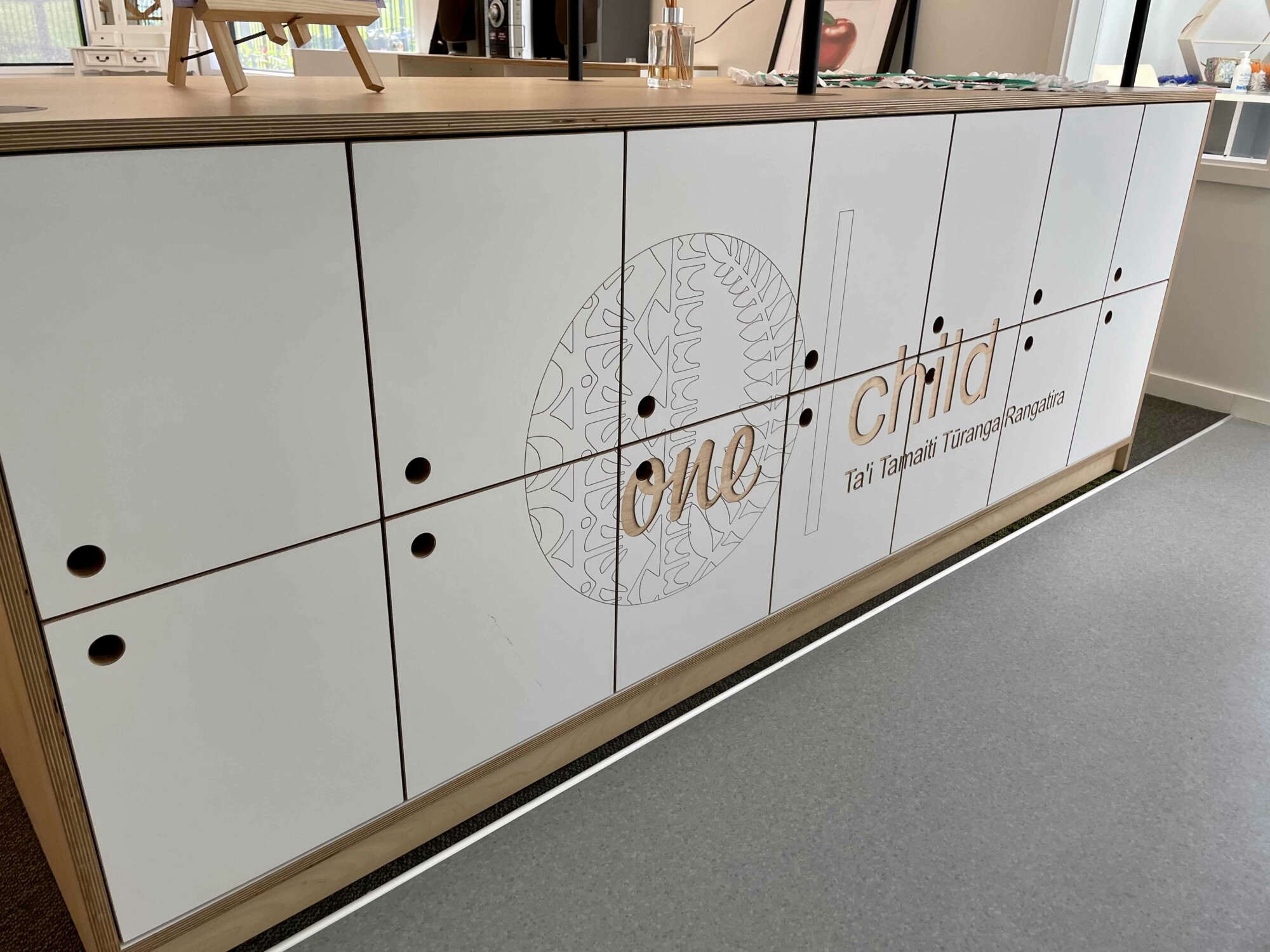 With this centre, there was a story to tell and together we found a way to communicate that story. I took inspiration from the traditional Cook Island houses with their straw roof shape to try and create a silhouette of the furniture pieces that was familiar. On the the locker doors we used the center’s logo and the art work from the center that tells the story of how the Cook Island people once came to New Zealand. We also engraved the play house. We used the lockers and storage units as dividers for the big open room that hosts all age groups, to separate the Infants from the Toddlers and Preschoolers. In the middle of the dividing wall we had tunnel seat units with a clear perspex window so that the separated age groups could still see and connect with each other.
